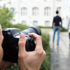 Kendi otomobiliyle takibe başlayan koca, eşini ve yanındaki kişiyi araçtan indikleri sırada cep telefonu kamerasıyla kayda aldı.